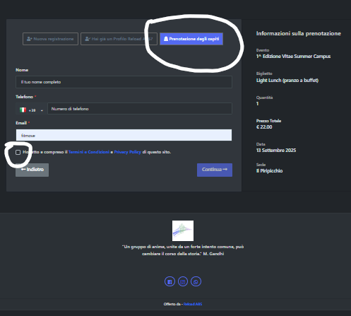 Quando visualizzi questa schermata, digita il pulsante "Prenotazione degli ospiti". Poi inserisci Cognome e Nome, Telefono e indirizzo e-mail. ricorda di spuntare termini e condizioni Privacy. poi digita il pulsante "continua"
