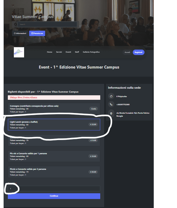 Seleziona il biglietto, inserisci la quantità n. 1 digita il pulsante "continua"