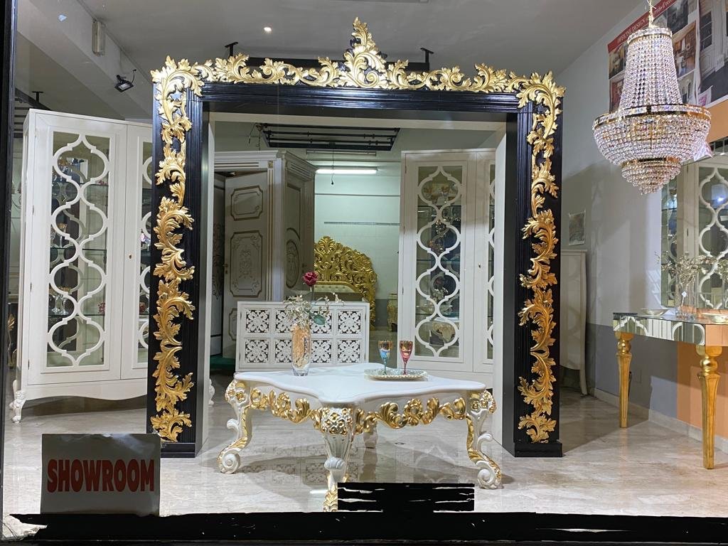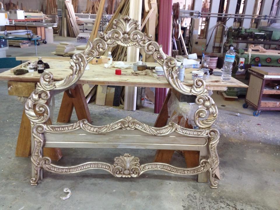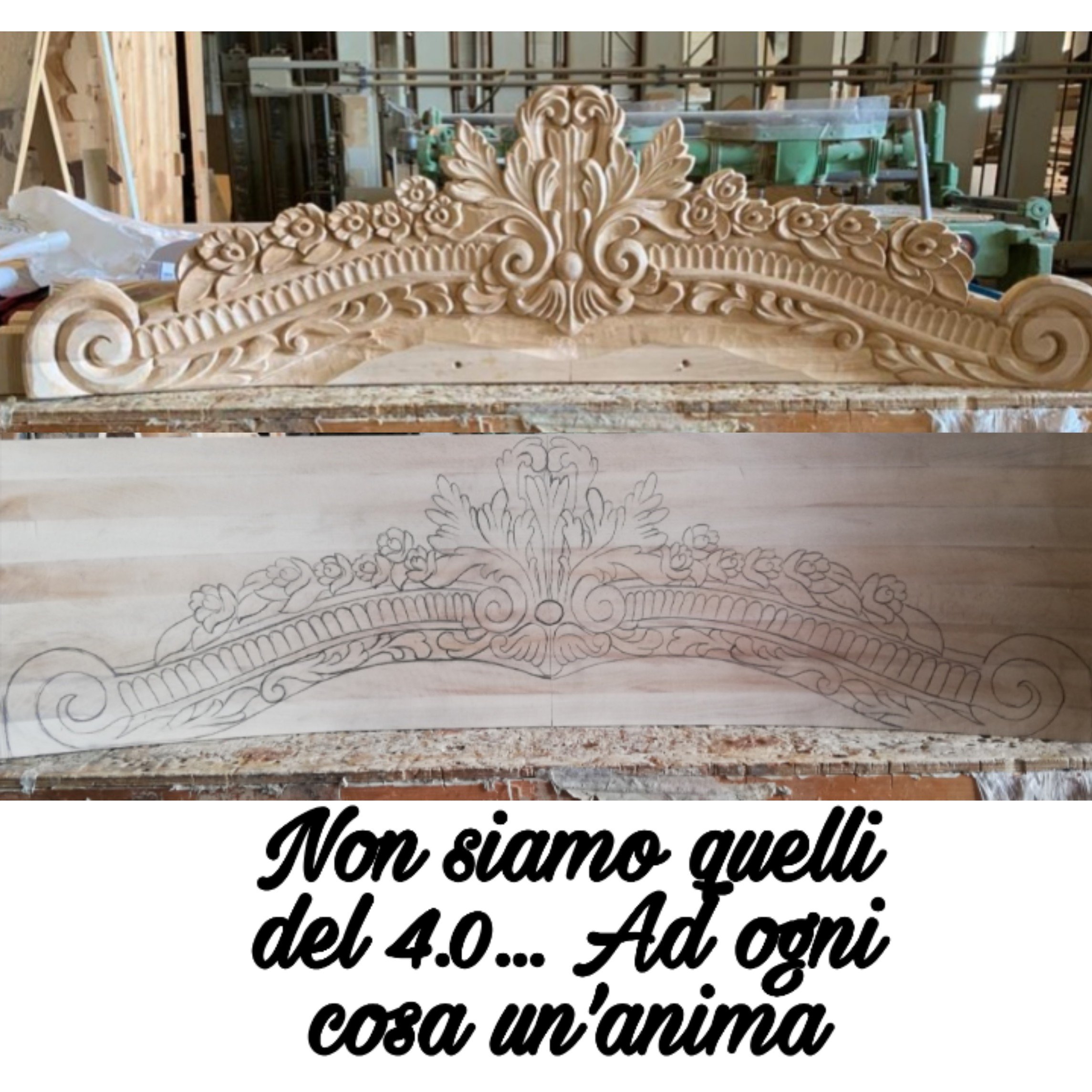 Scolpitura con strumenti governati sia da AI come pantografi sia da strumenti tradizionali come scalpelli e sgorbie , completate a mano con decorazione e finitura in foglia che risaltano la spirito delle maestranze aziendali, giusto connubio di tecniche tradizionali e metodi innovativi.